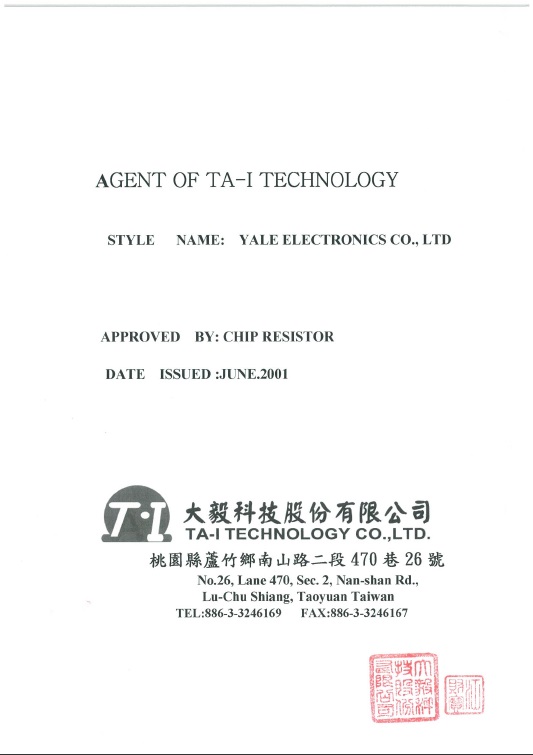 (주) 예일전자는 2001년 TA-I TECHNOLOGY CO.,LTD.와의 대리점 협약체결로 TA-I 사의 공식 회원사로 인정받아 칩 저항(CHIP RESISTOR) 수입유통을 담당하는 회사로 설립되었습니다.